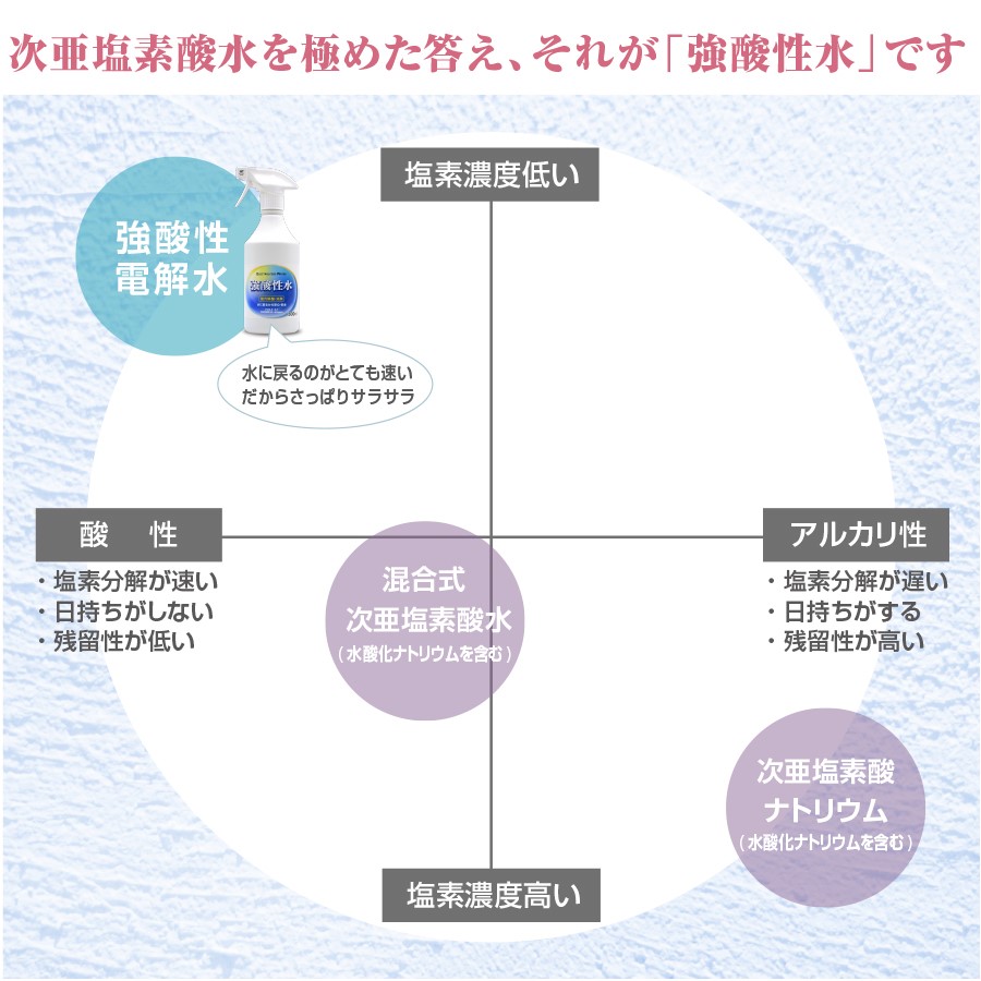 ほとんどが500ppm前後の高塩素濃度で、強酸性の商品はありません。また高塩素濃度でなければ効果は薄いので、厚生労働省より新型コロナウイルスに対しては80ppm以上で使用してほしいとの記載があります。しかし高い塩素濃度は、それだけ皮膚に対して痛める危険性も高くなってしまいますし、分解の速度も強酸性に比べると遅いので痛める時間も長くなってしまいます。また混合式はハイターなどの次亜塩素酸ナトリウムで作られているので、洗剤の原料である水酸化ナトリウムを含む商品を手指に使用する事は、お勧めできないと思います。