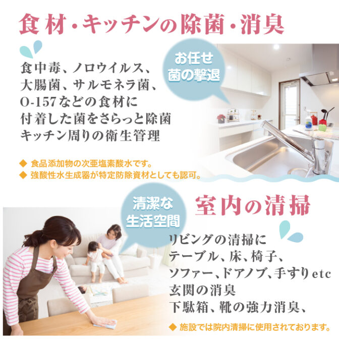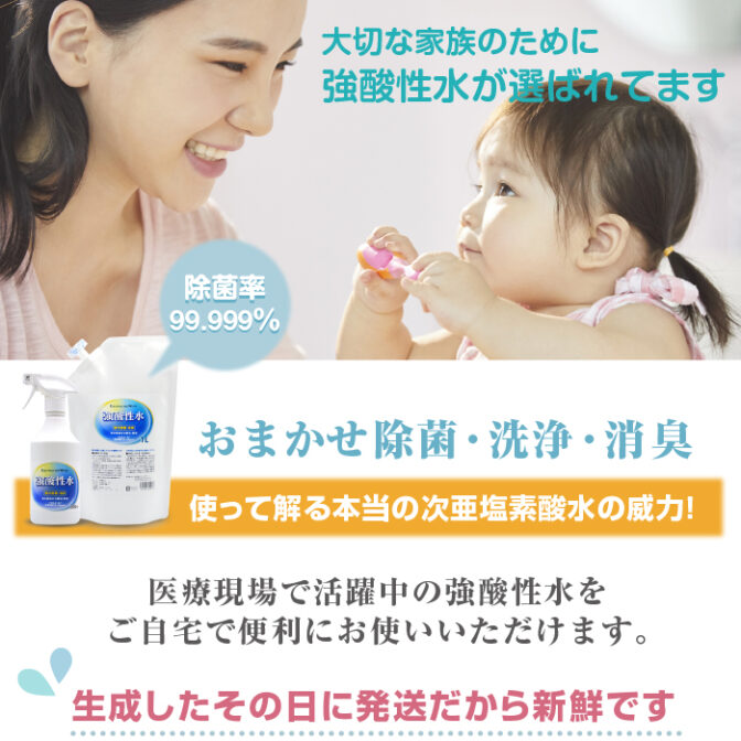 エースライフでは、殺菌・消毒・消臭効果が期待できる強酸性電解水(次亜塩素酸水)を取り