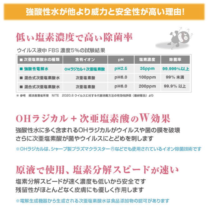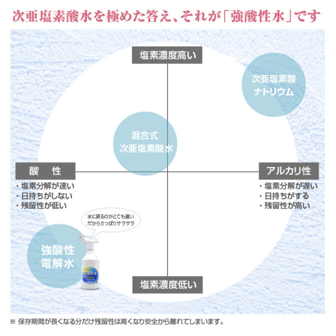 また塩が残ってしまっている一般の強酸性水は10日ほどで殺菌成分の次亜塩素酸が無くなって
