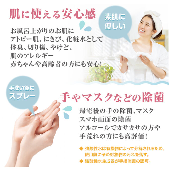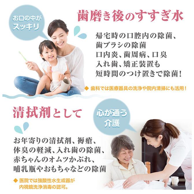 介護用品などの除菌・消臭や、アトピー・敏感肌の方への消毒、マウスウォッシュにも使用可能です。