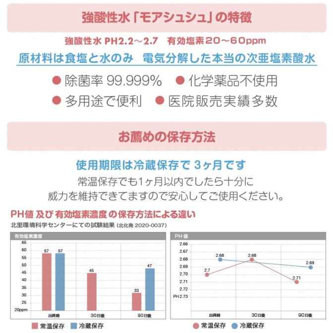 ※強酸性水は本物の次亜塩素酸水のため、未開封でも生成日から劣化が始まります。消費期限は生成日から冷蔵で3ヶ月、常温で1ヶ月。その分解しやすい性質だからこそ、安全性が高いのです。