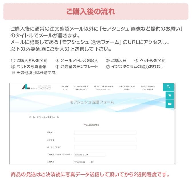 1点1点オーダーメイドでお作り致しますので、お届けまでには決済後の写真データ送信から約2週間掛かることに、ご注意ください。